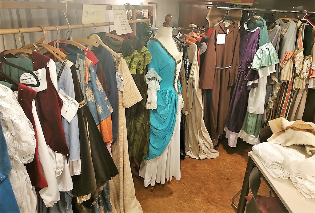 Das Angebot reicht vom Mittelalterkostüm über Kinderwaffenröcke, Meerjungfrauen- und Hexenkostüm bis hin zum Rokoko-Kleid. Neben den gebrauchten Kostümen gibt es auch jede Menge ungetragene Stücke aus der Gewandschneiderei des Fähnlein zu Dillenburg.